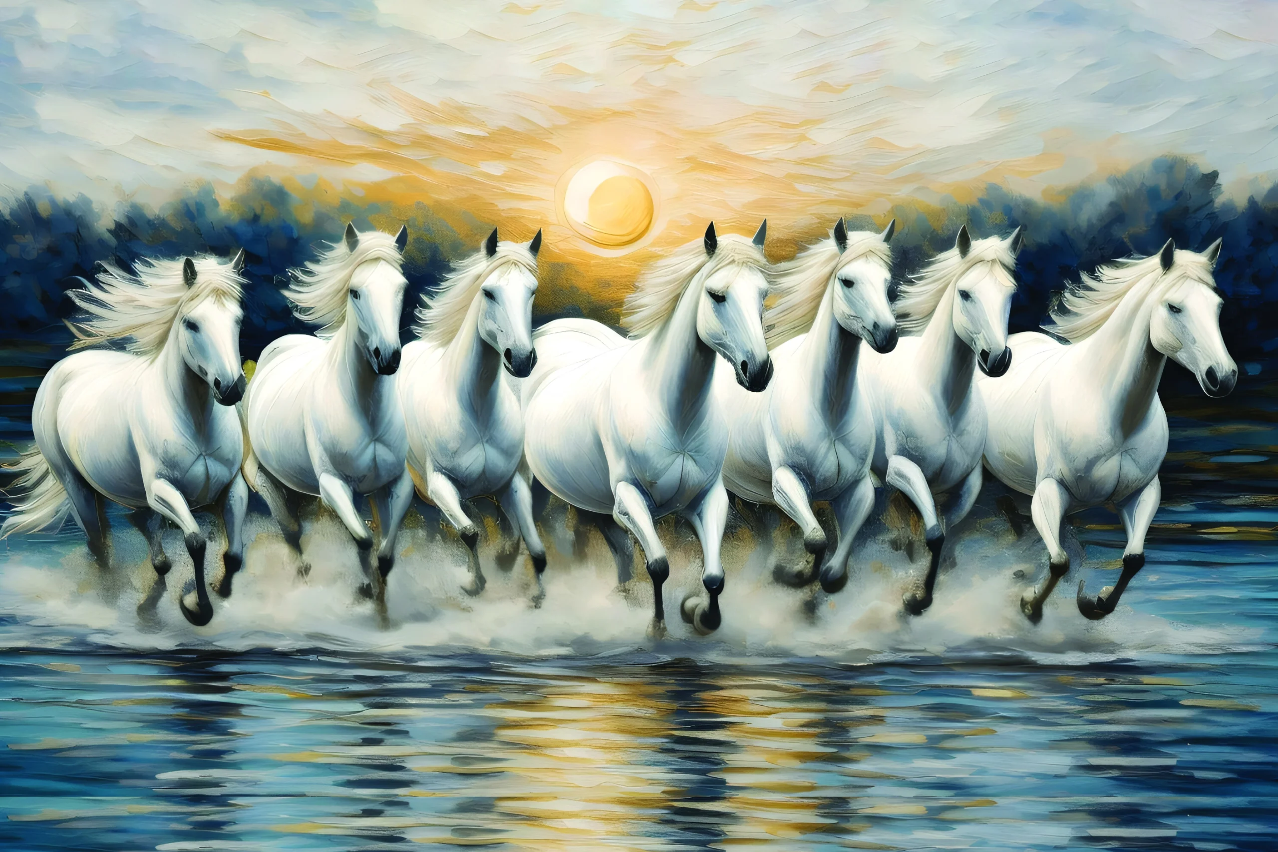 Transform your space with the timeless beauty of this Running White Horses Canvas Wall Art. The artwork captures a breathtaking moment of strength and grace—white horses charging forward through shimmering water under a glowing sunset sky. Symbolizing freedom, power, unity, and success, this piece makes a bold yet refined statement on any wall.