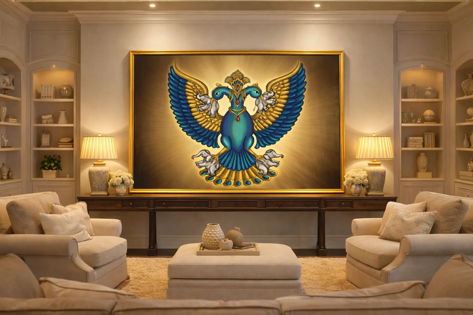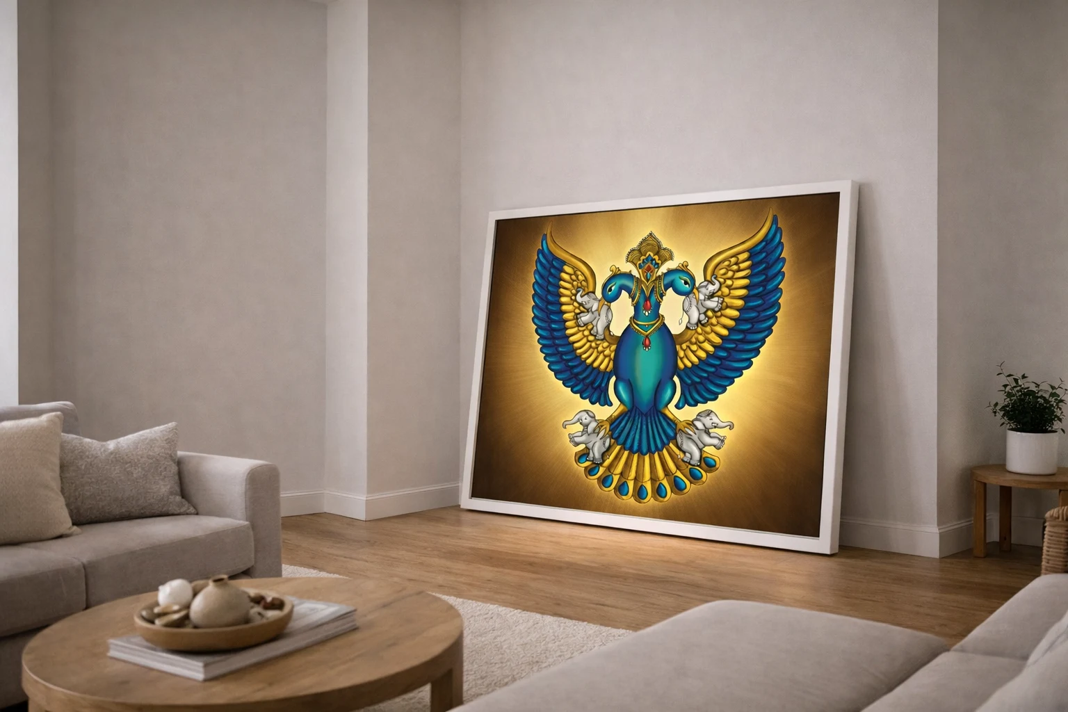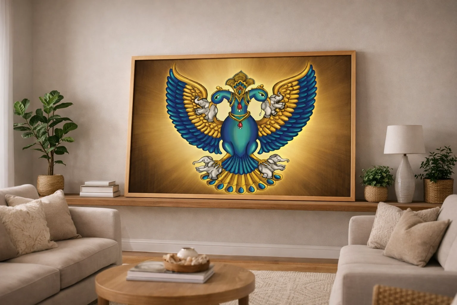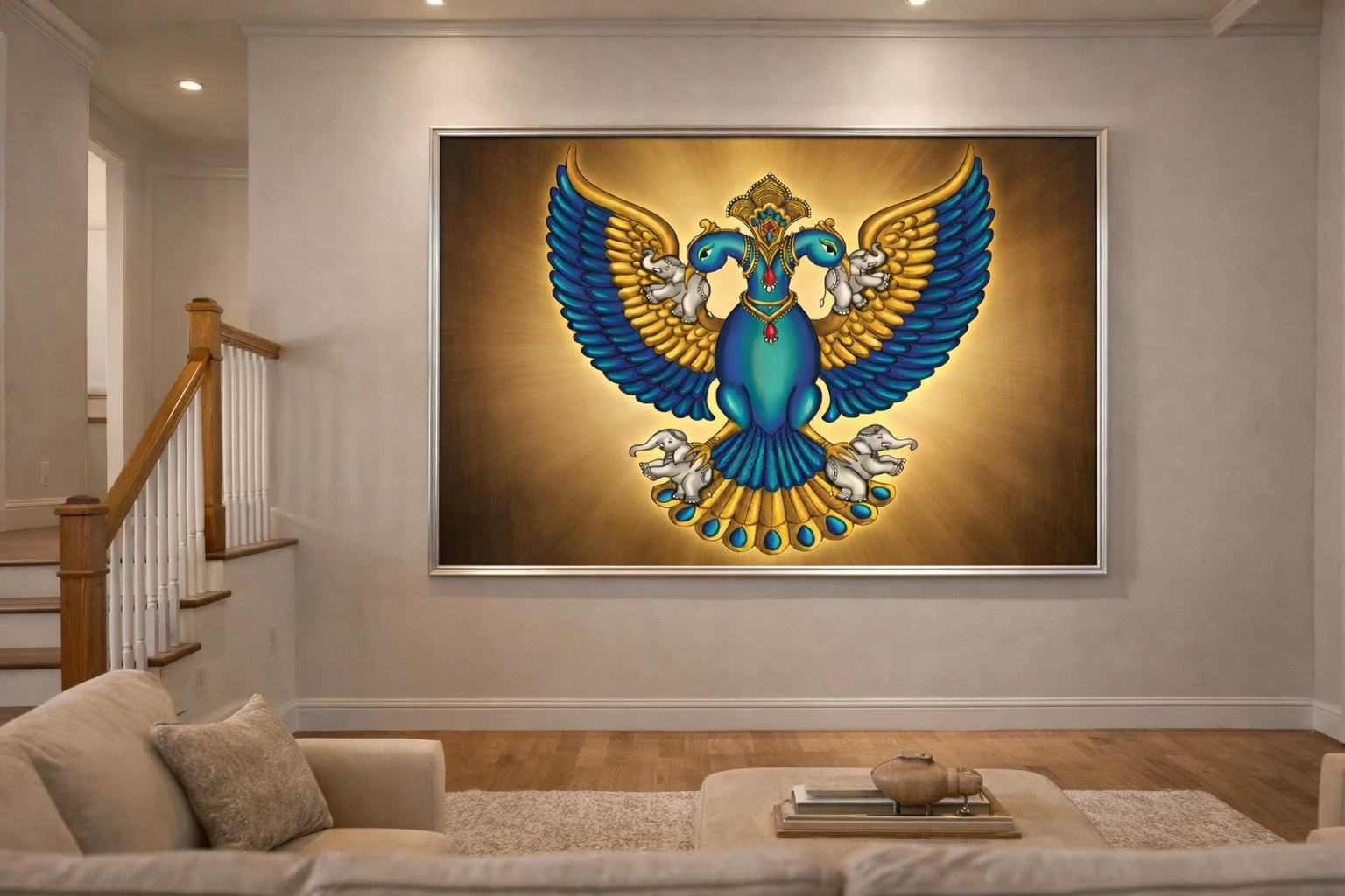 A powerful and majestic Garuda canvas artwork symbolizing strength, protection, and divine energy—perfect for elevating living room interiors with spiritual elegance.