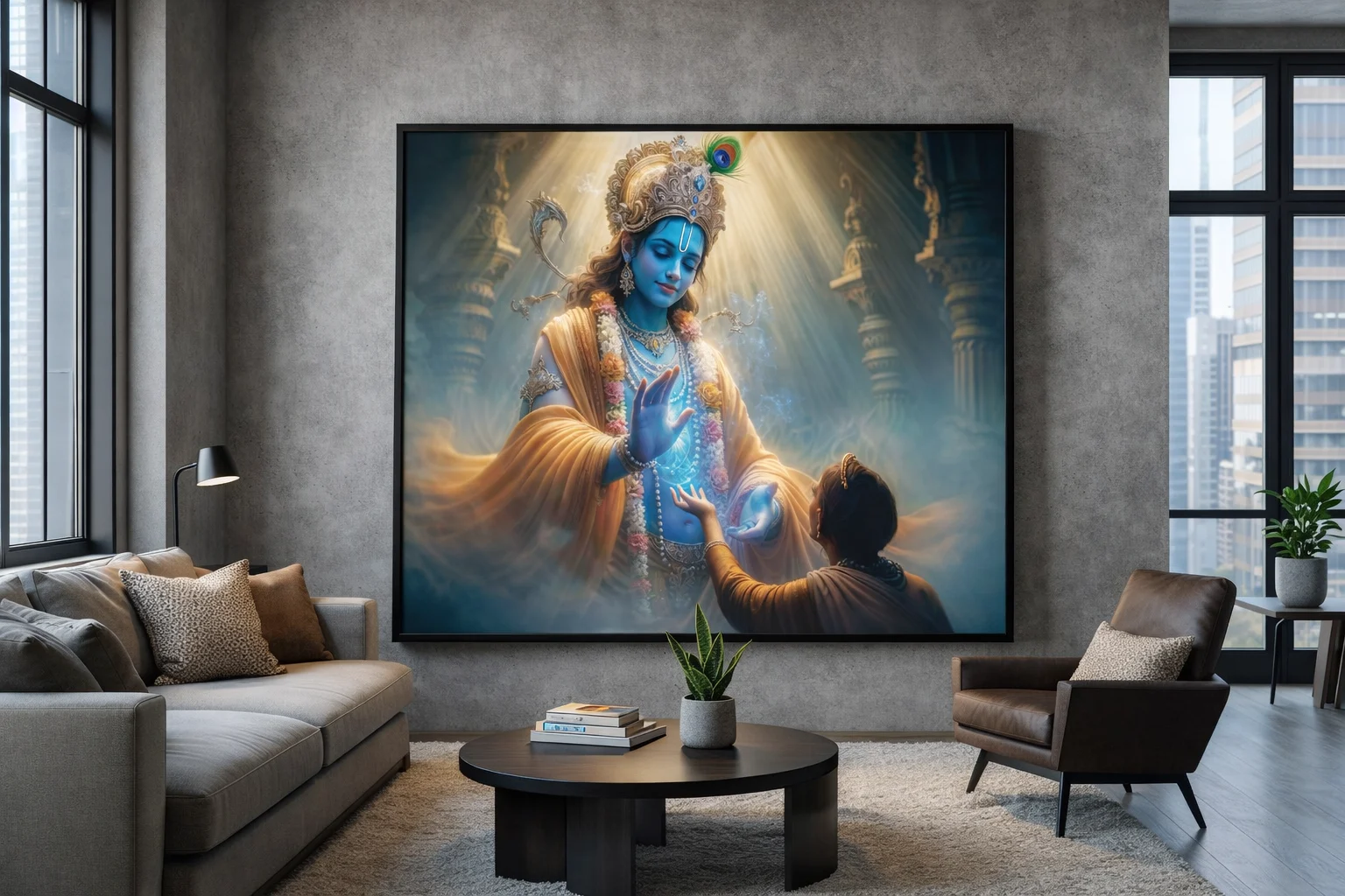A powerful and serene canvas artwork depicting Lord Krishna blessing a devotee, designed to bring peace, faith, and spiritual elegance to modern living spaces.