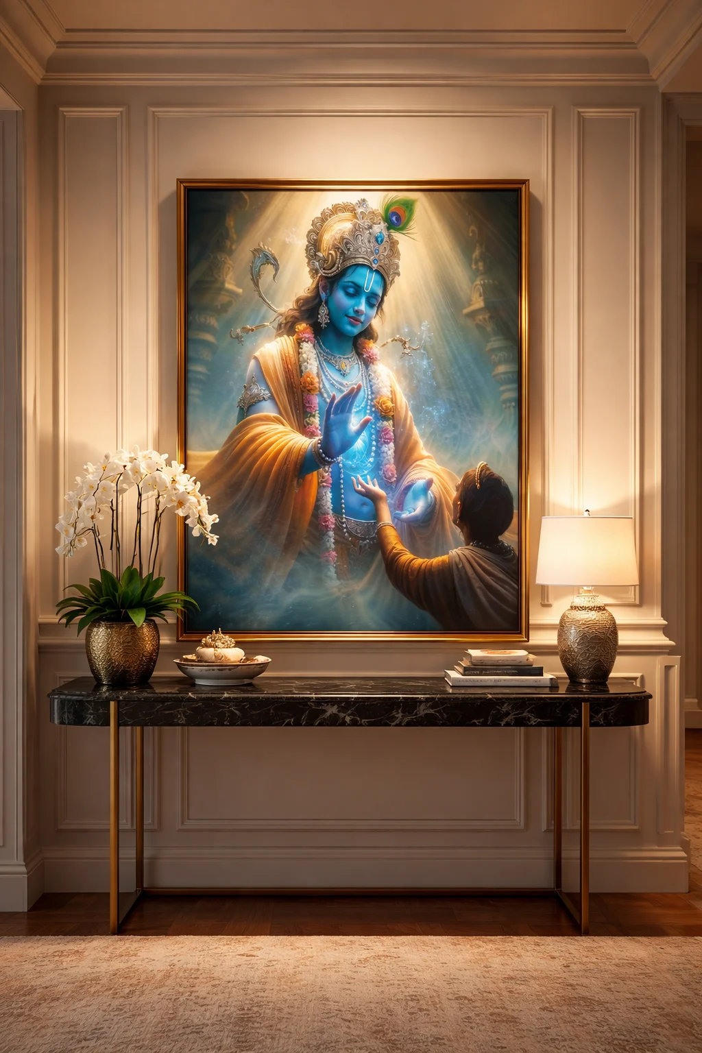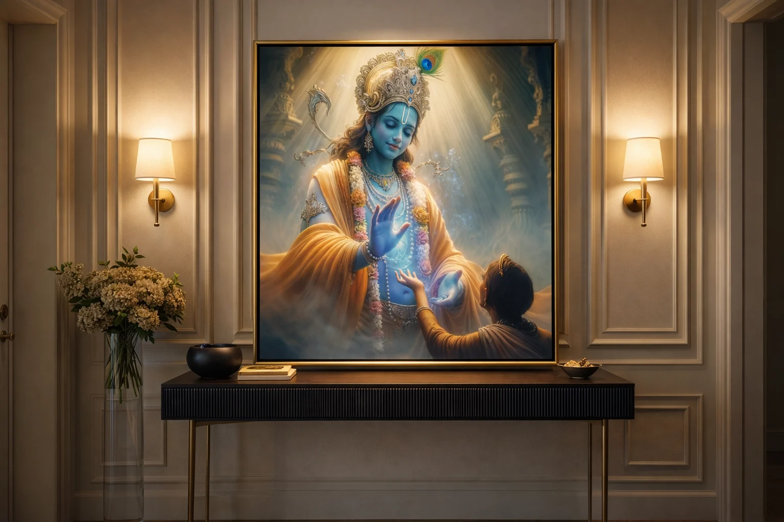 Placing Krishna artwork near entrances symbolizes welcoming divine blessings into the home. It creates a strong first impression for guests while maintaining positive energy within the living space.