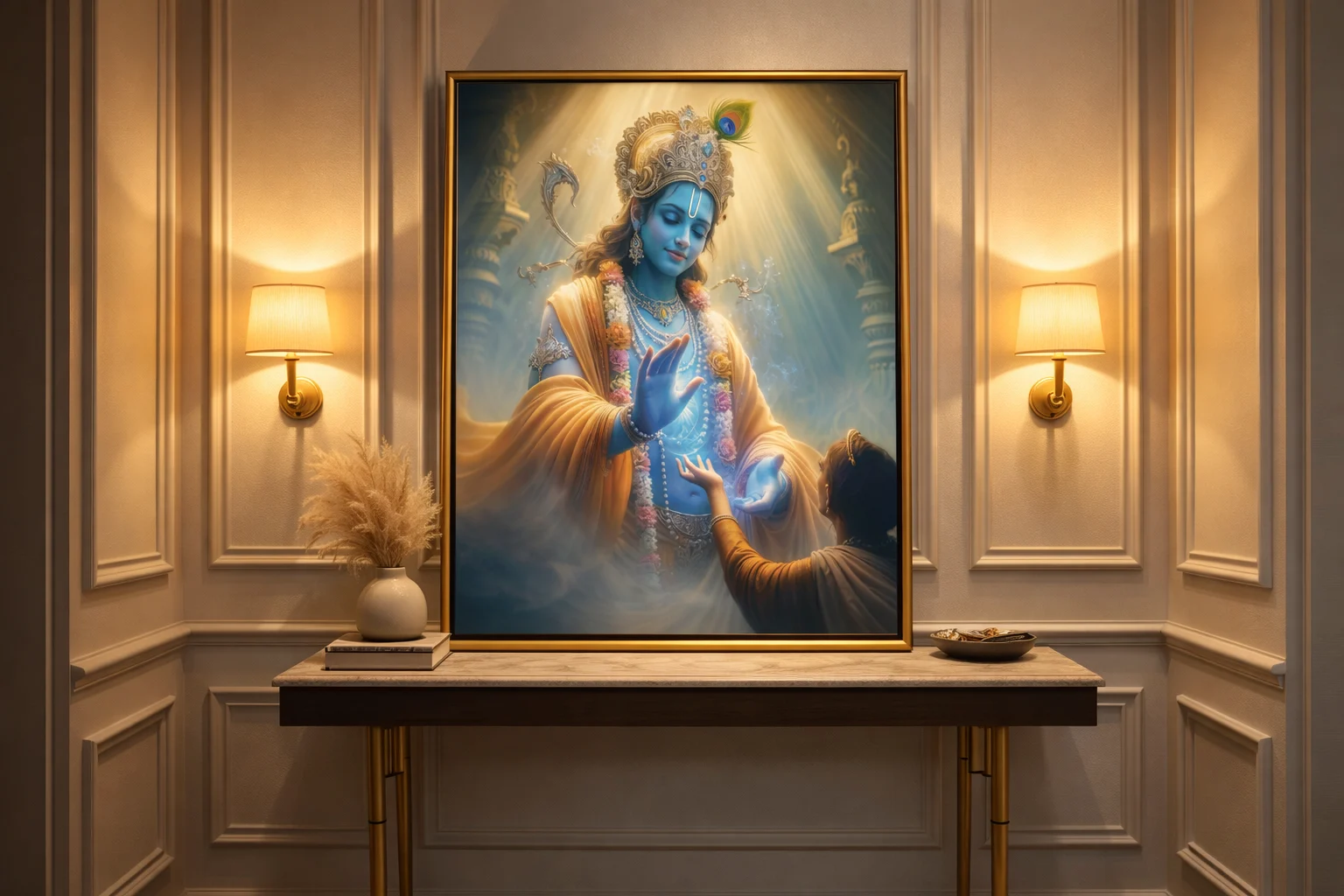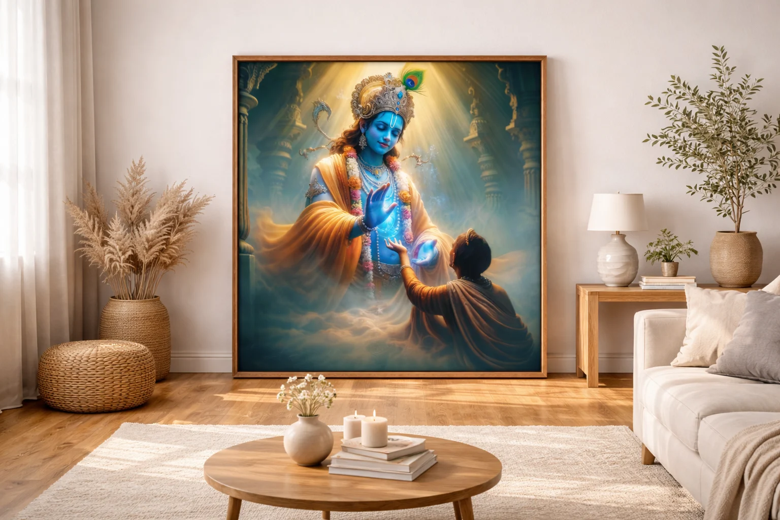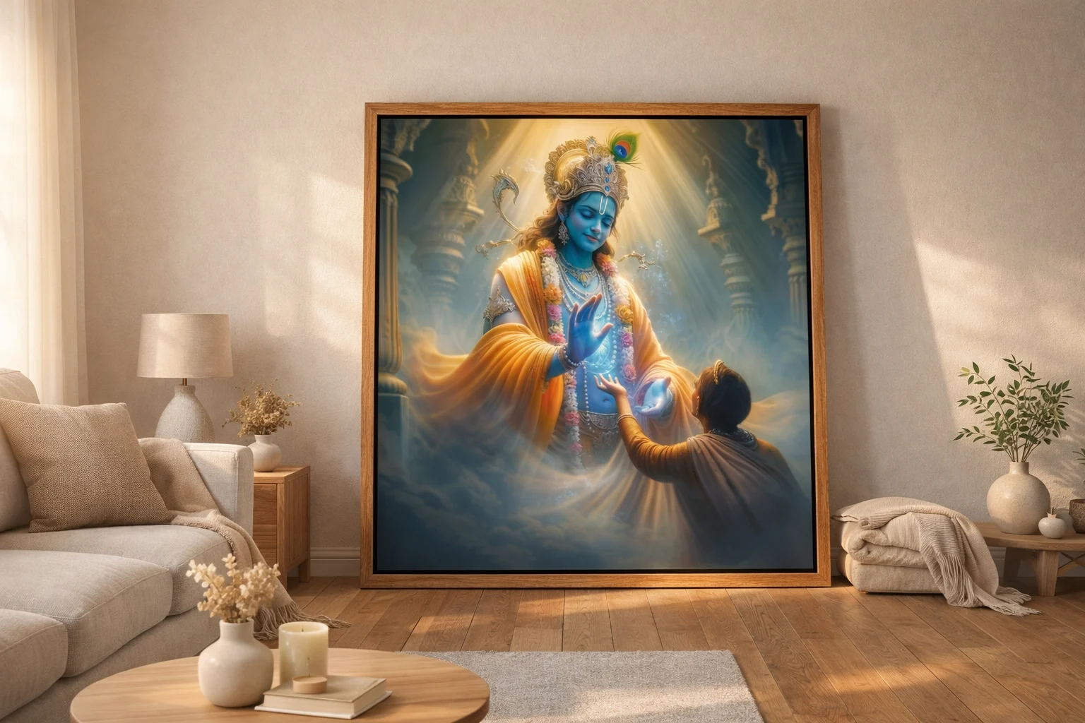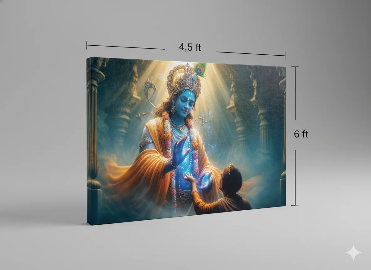 Another important advantage of this artwork lies in its visual storytelling. The gentle blessing gesture, glowing divine light, and interaction between Krishna and the devotee create an emotionally moving composition. Unlike generic decorative prints, this artwork tells a meaningful spiritual story that resonates deeply with viewers.