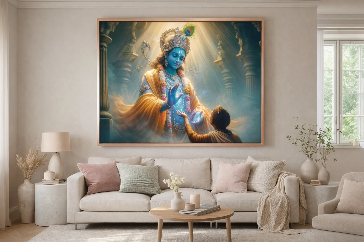 Overall, choosing this lord Krishna Blessing canvas wall art  ensures a combination of spiritual value, artistic elegance, and long-term durability—making it a meaningful investment in both décor and devotion.
