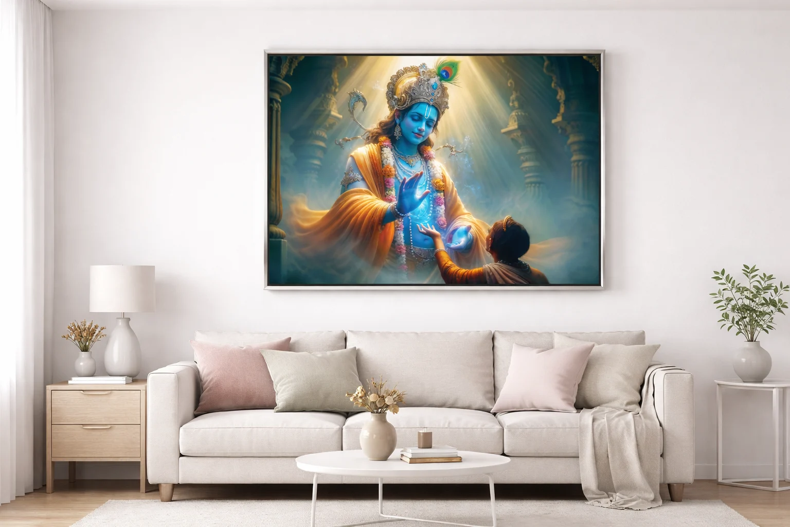 The Divine Lord Krishna Blessing Canvas Wall Art is designed to enhance multiple spaces within residential and professional environments. Its 36 × 48 inch horizontal orientation makes it suitable for wide wall areas where it can create a balanced visual presence.