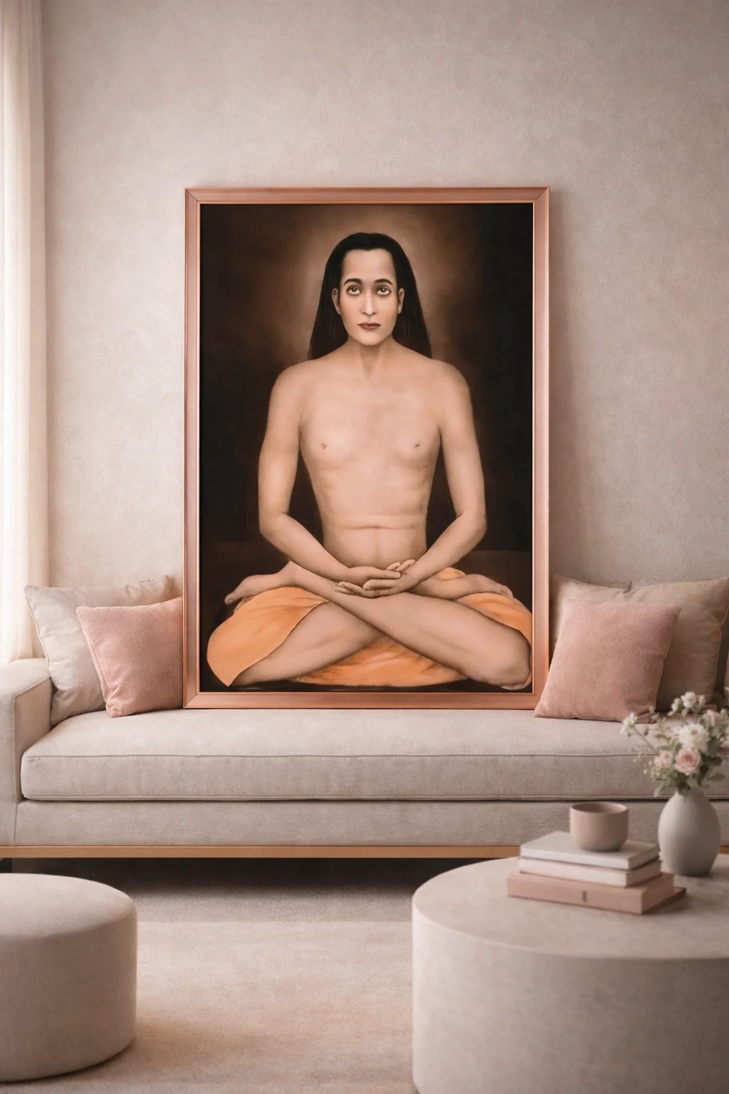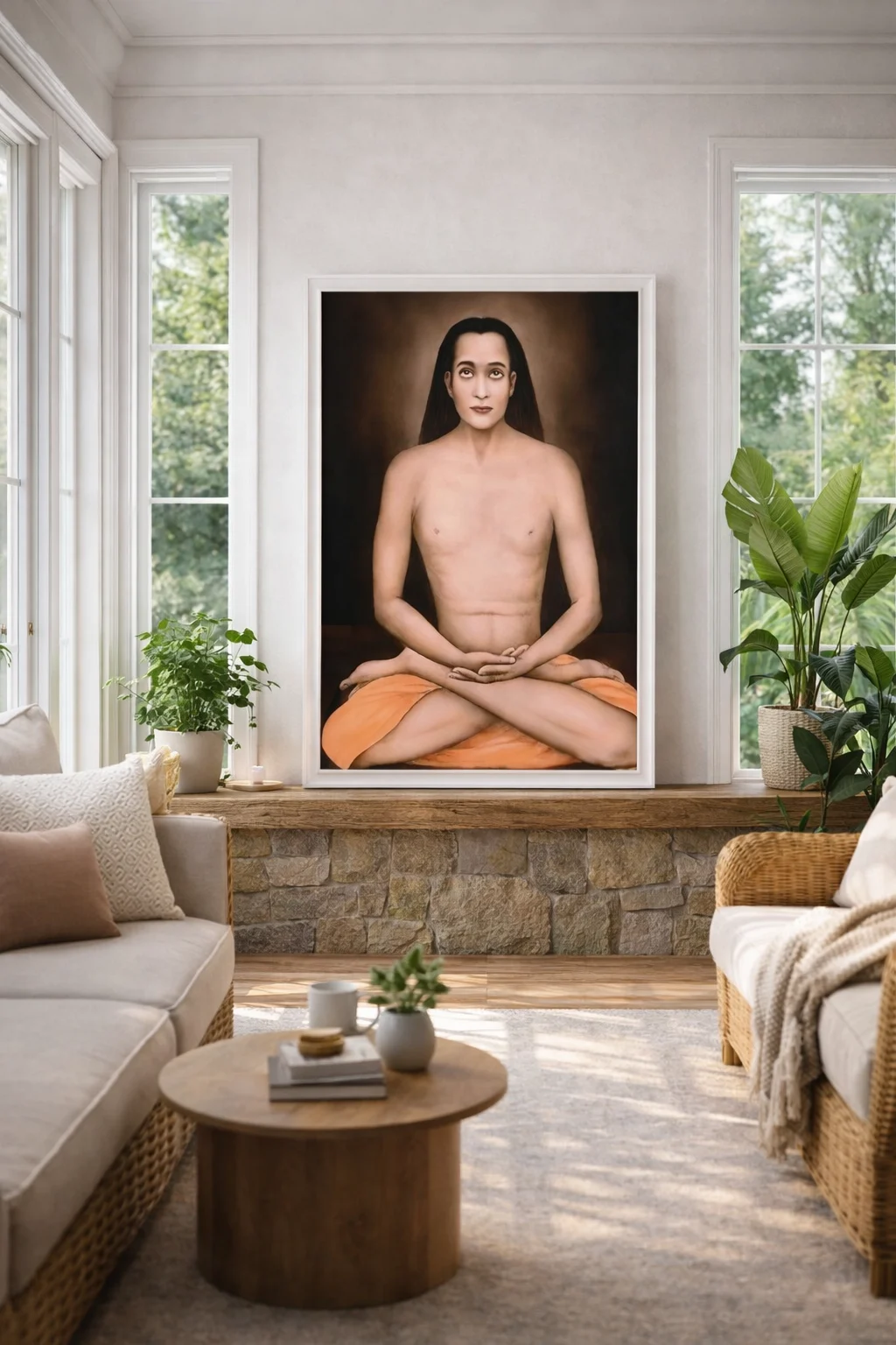 The warm background tones used in this Meditative Yogi Spiritual Canvas Wall Art create a soft glow that enhances visual calmness. The gentle contrast between the subject and background adds depth, making the spiritual portrait canvas wall art visually engaging while maintaining simplicity.