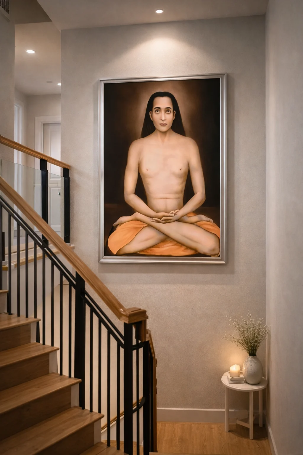 This spiritual yogi canvas wall art works best in areas where calmness, focus, and peaceful energy are desired. Its tall vertical layout fills narrow spaces effectively while maintaining visual balance.