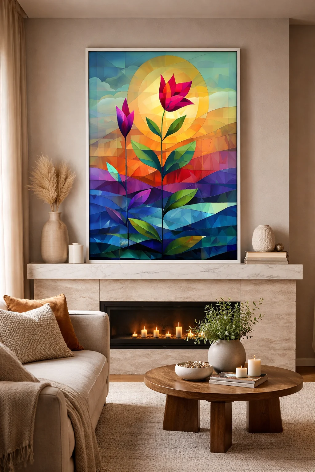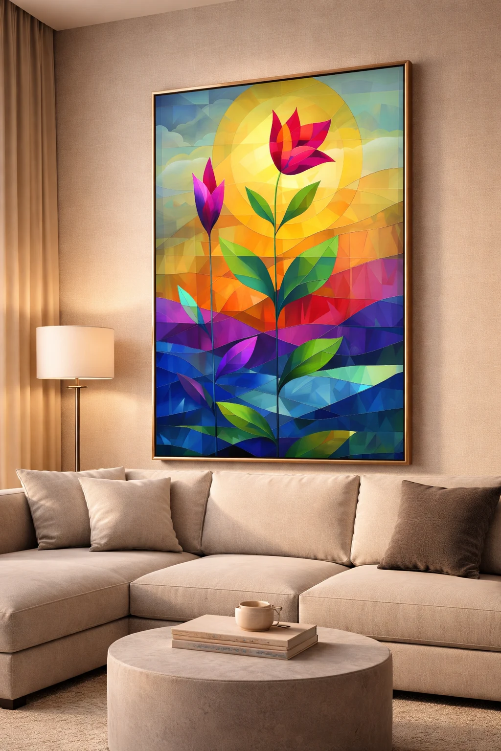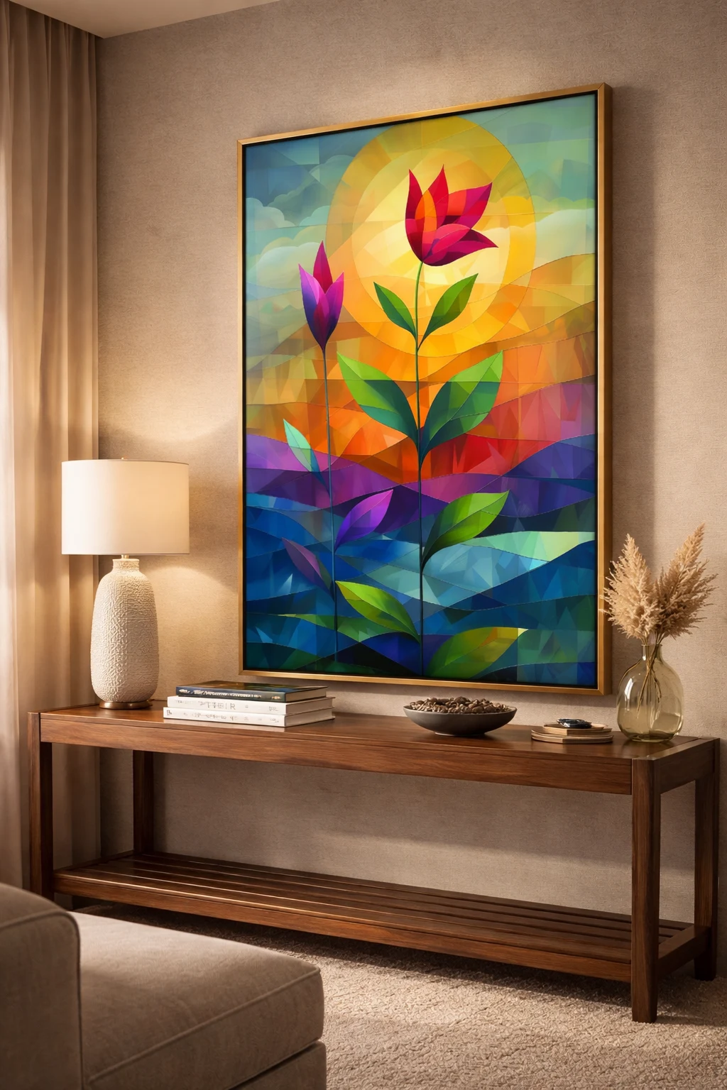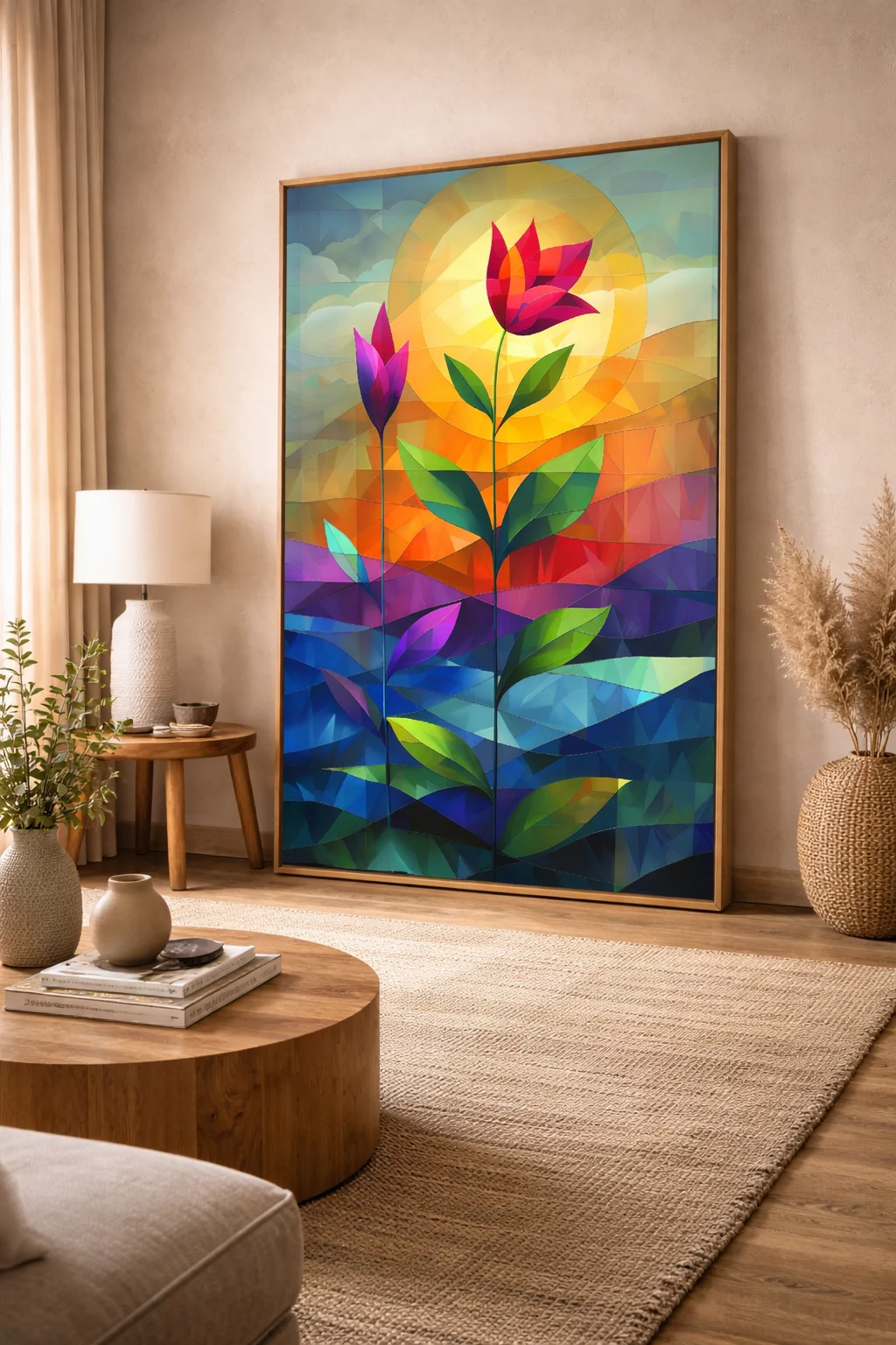 One of the strongest reasons to choose this artwork is its modern geometric floral design, which combines nature-inspired forms with structured geometric elements. This fusion creates a balanced visual composition that feels both artistic and contemporary. The tall floral stems symbolize growth, ambition, and positive transformation, making this artwork ideal for inspiring environments.