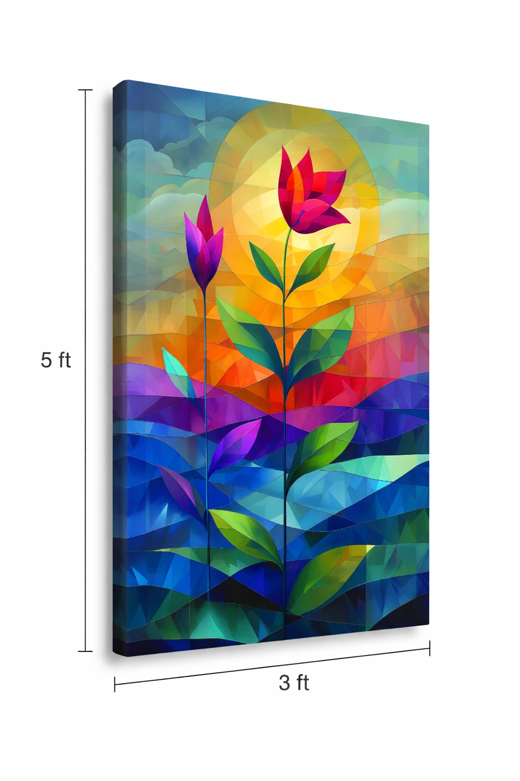 The Modern Geometric Floral Canvas Wall Art (60 × 36 Inches) is a bold and visually captivating decorative piece designed to enhance modern interiors with vibrant color and geometric precision. Inspired by contemporary abstract design, this artwork combines stylized botanical elements with geometric shapes to create a dynamic and energetic visual experience.