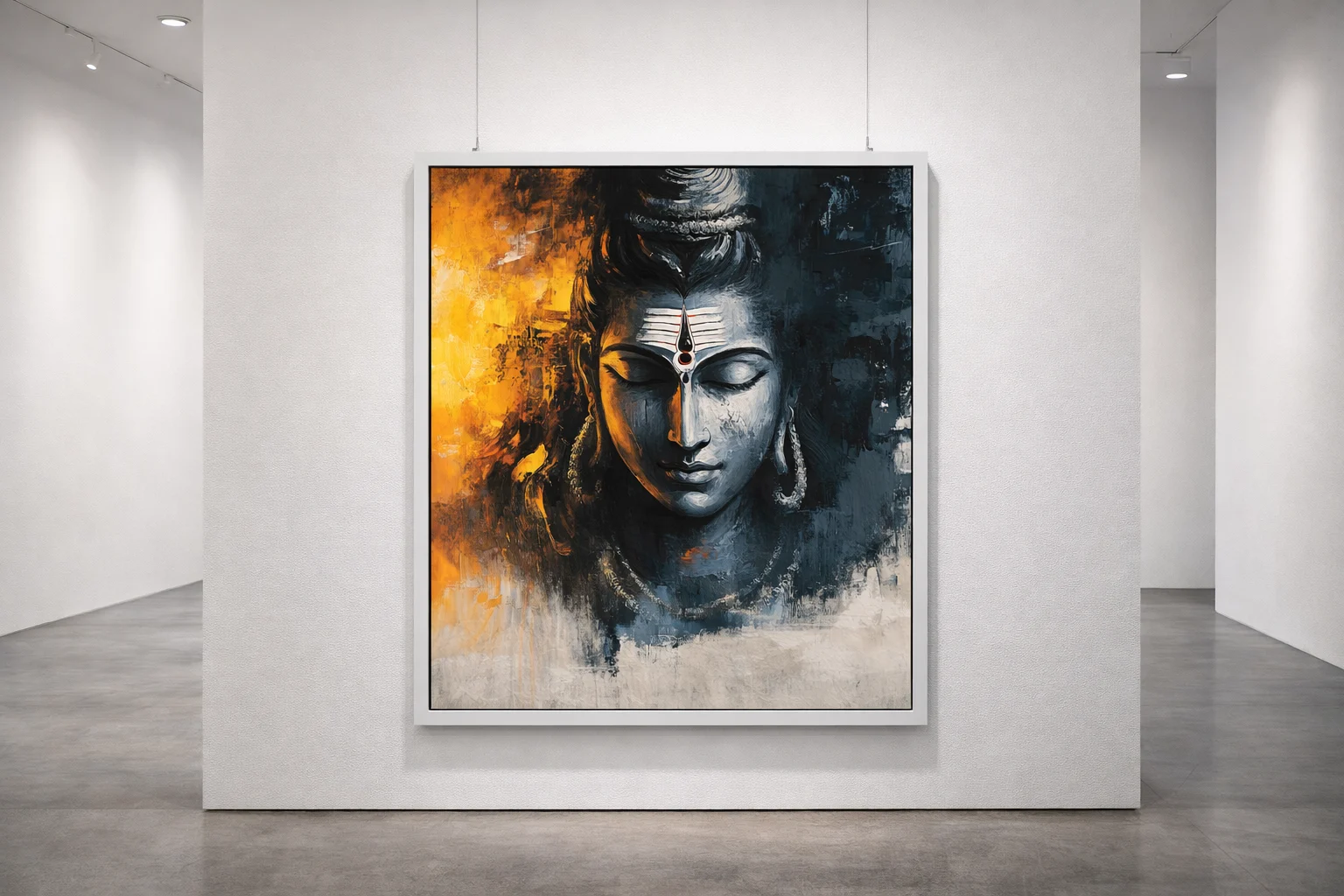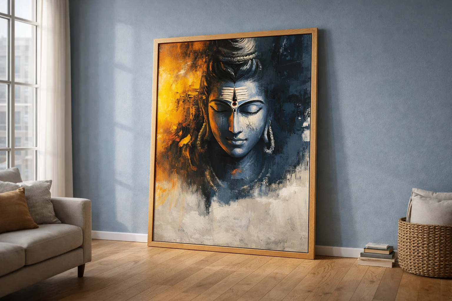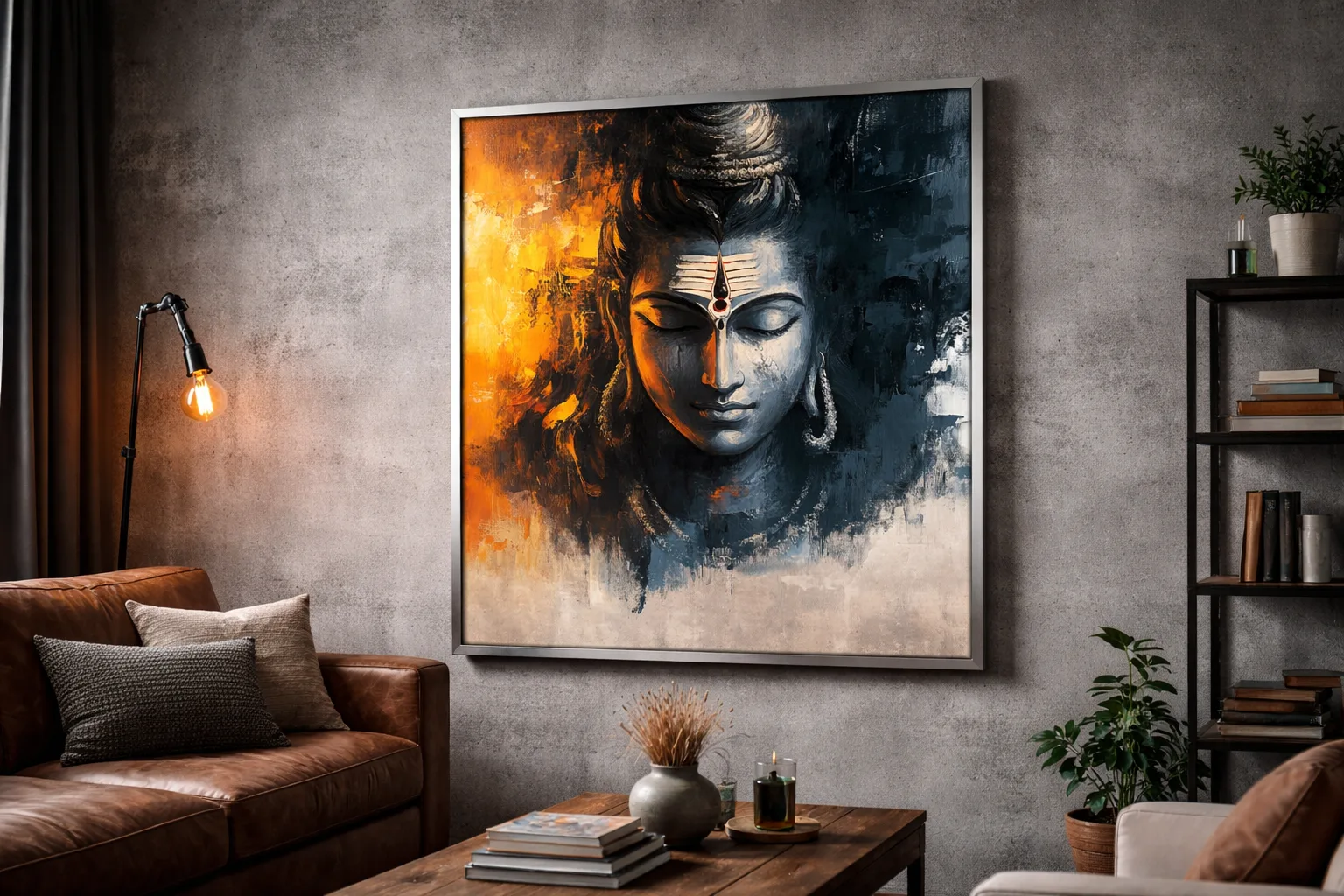 The Modern Lord Shiva Canvas Wall Art (36 × 48 inches) is designed for individuals seeking powerful spiritual wall décor, Shiva meditation artwork, and modern Hindu devotional canvas paintings.