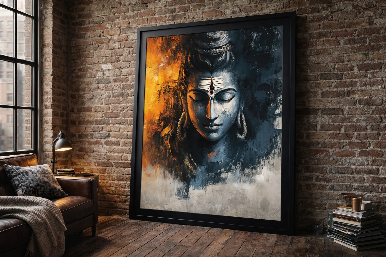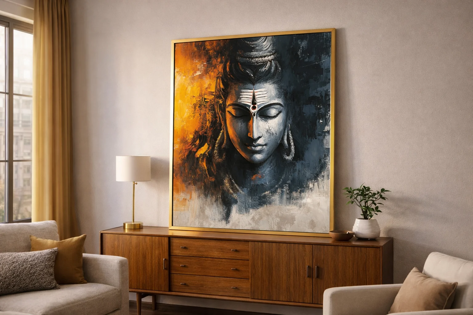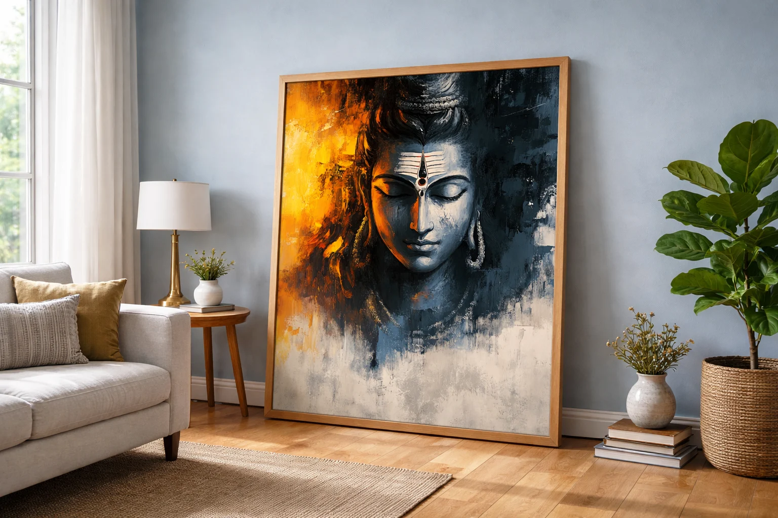 The Modern Lord Shiva Canvas Wall Art (36 × 48 inches) is designed for individuals seeking powerful spiritual wall décor, Shiva meditation artwork, and modern Hindu devotional canvas paintings.