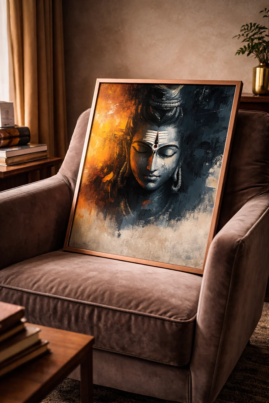 Meditation spaces require calming visuals that support concentration and mindfulness. Lord Shiva’s serene expression makes this artwork particularly suitable for meditation rooms.