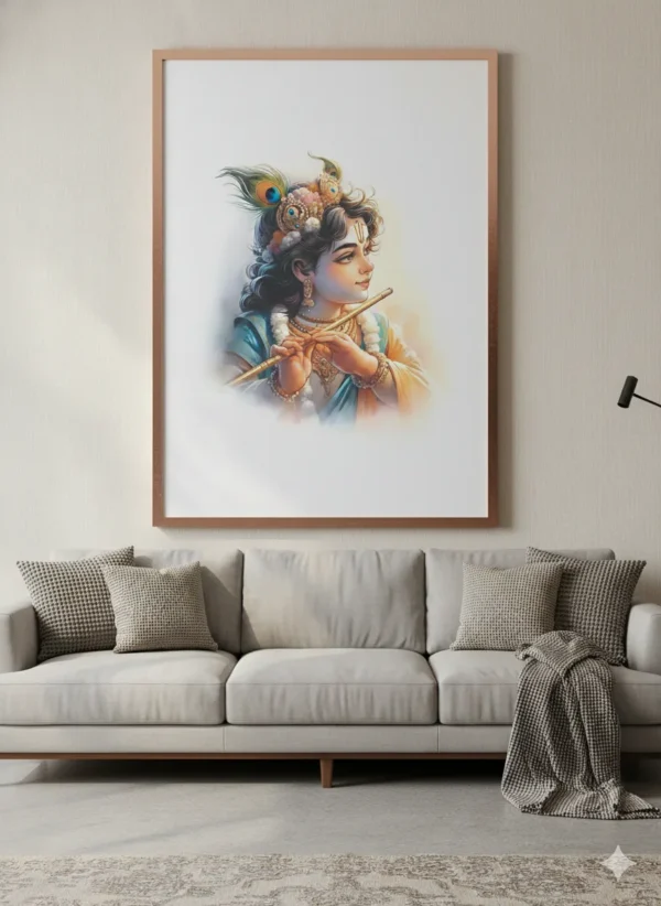The subtle depiction of Krishna’s flute adds symbolic meaning to the artwork. The flute represents melody, unity, and divine communication. It reflects the idea that love and devotion create harmony in life. The 36 × 48 inch size ensures the artwork becomes the visual centerpiece of the room. It fills wide wall spaces effectively while maintaining proportional balance.