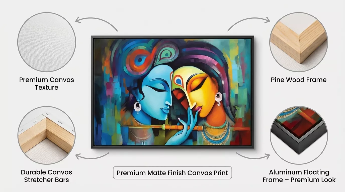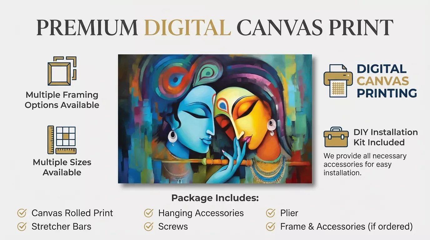 Because of its symbolic depth and aesthetic appeal, this Radha Krishna canvas is also widely chosen as a thoughtful gift.