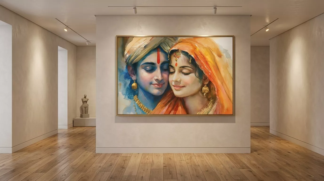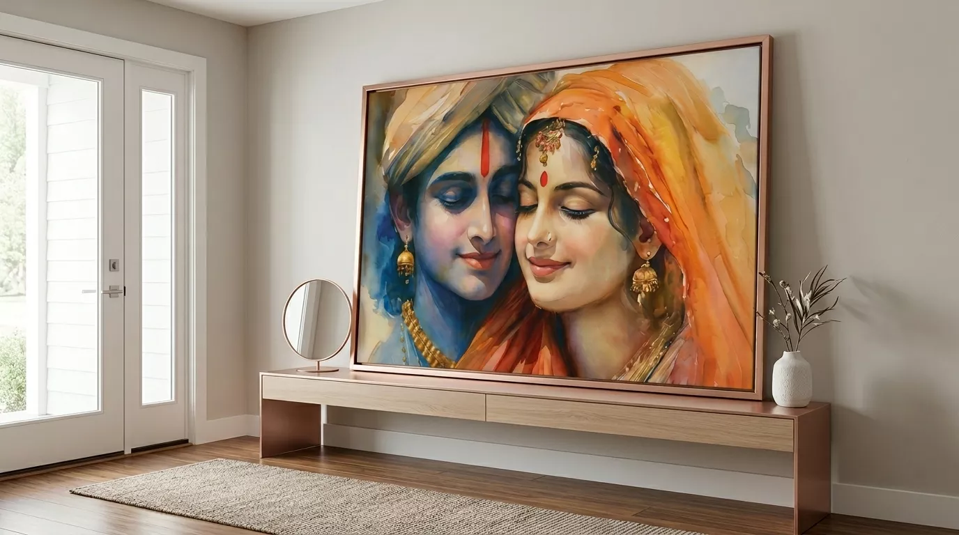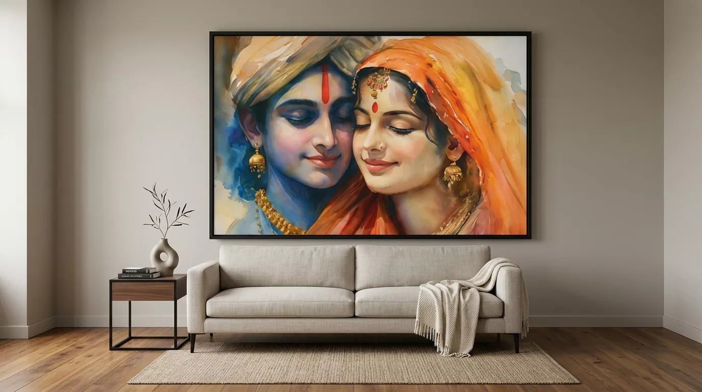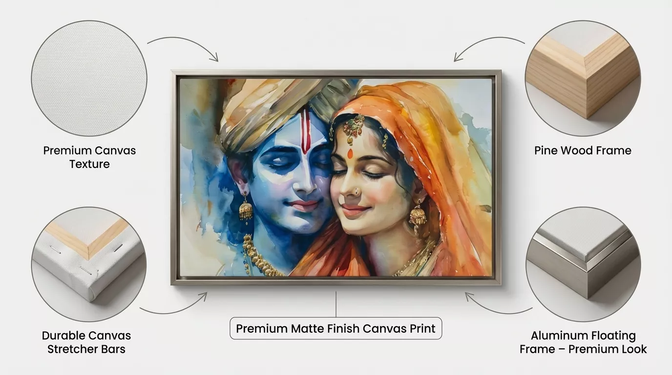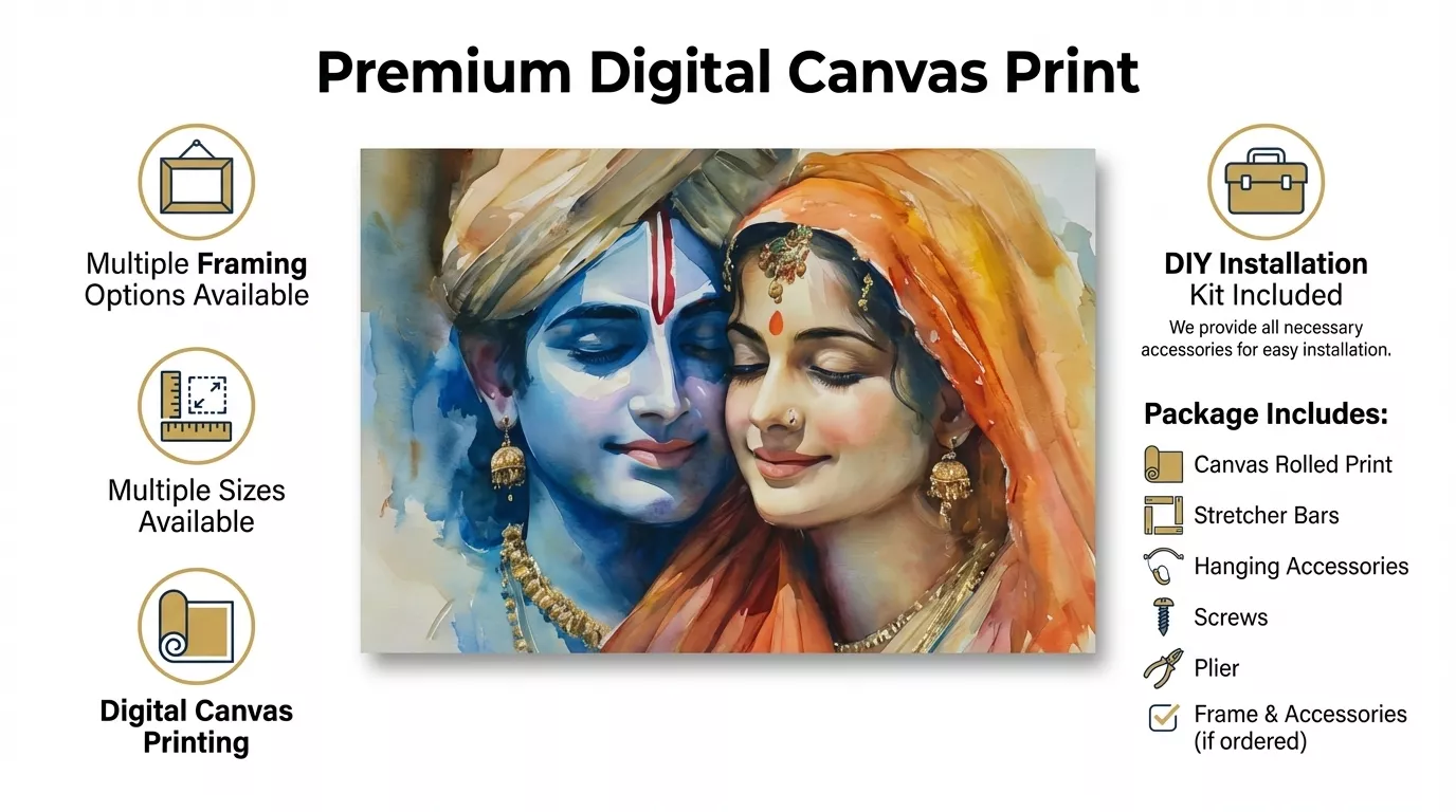 The Radha Krishna Love Canvas Wall Art is available with premium framing options that enhance durability and presentation.