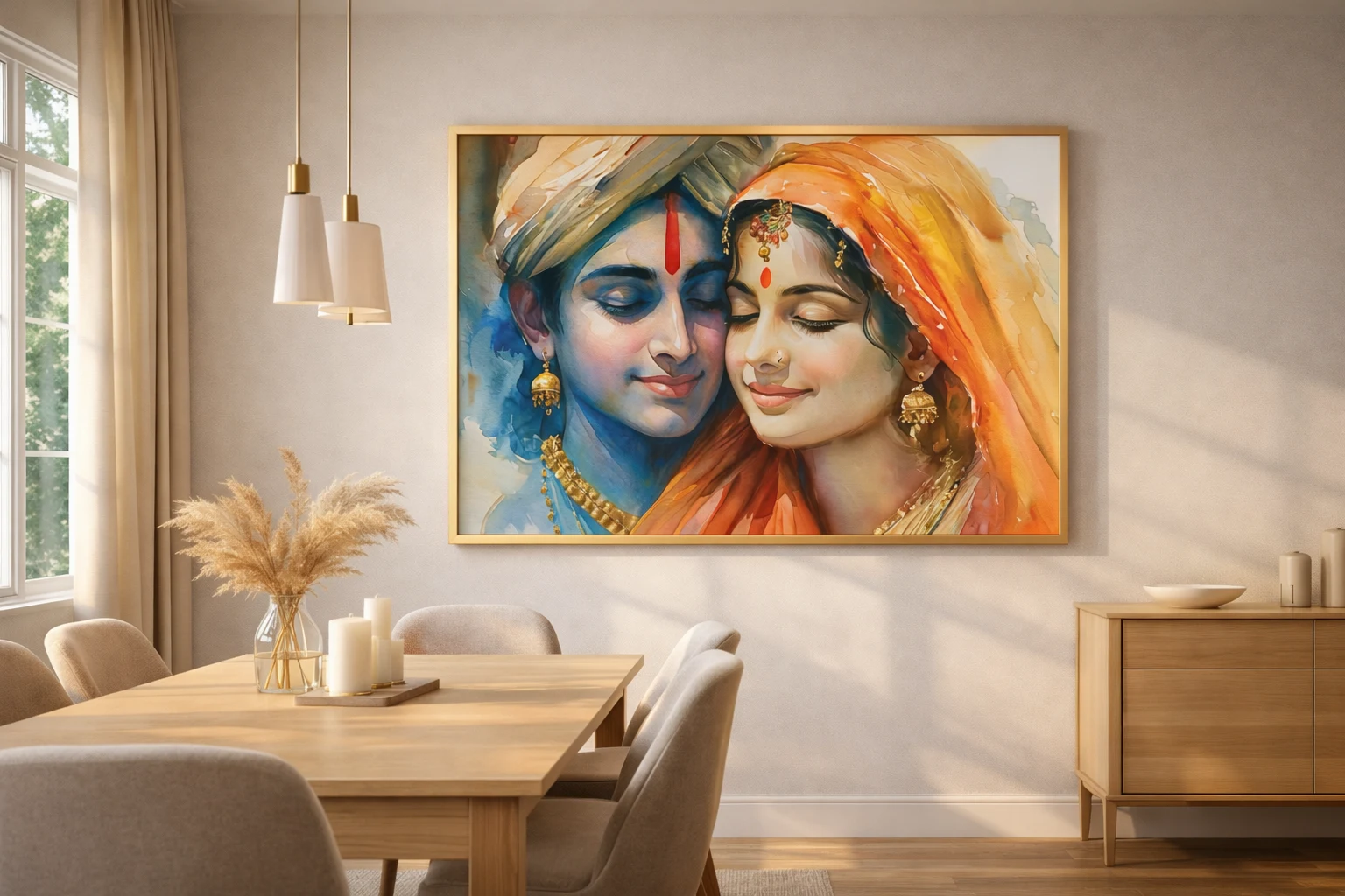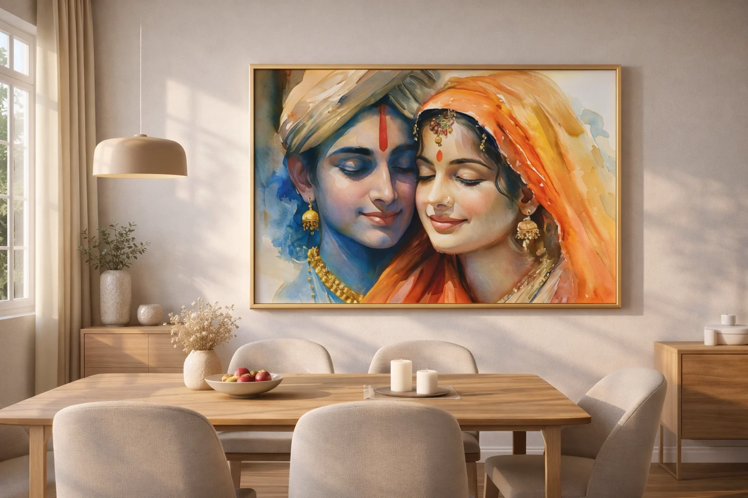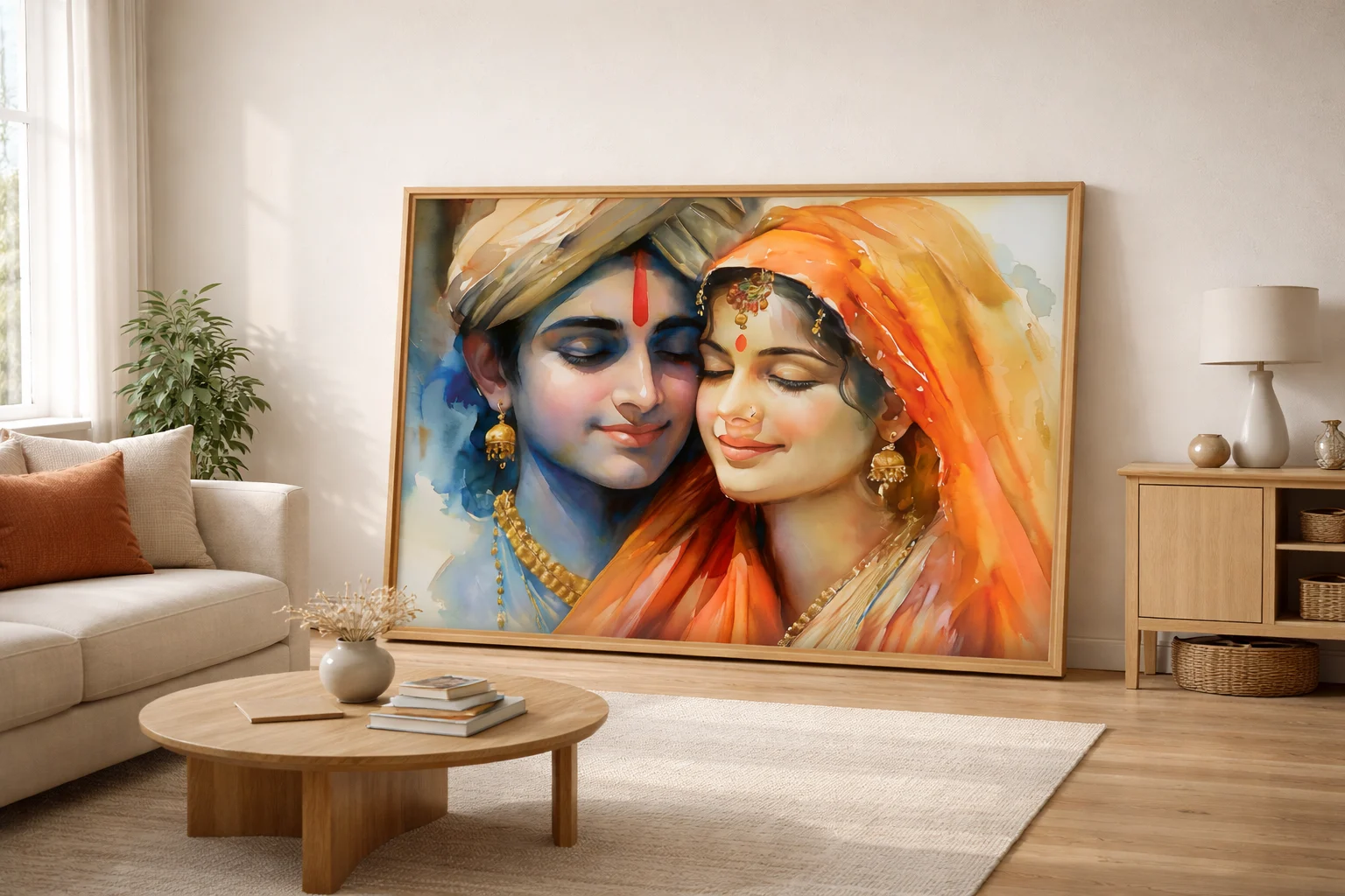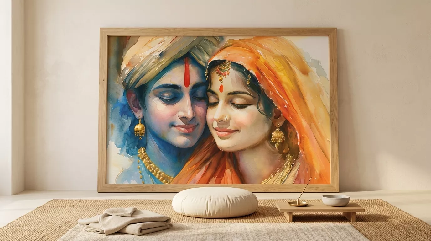 The Radha Krishna Love Canvas Wall Art is available with premium framing options that enhance durability and presentation.