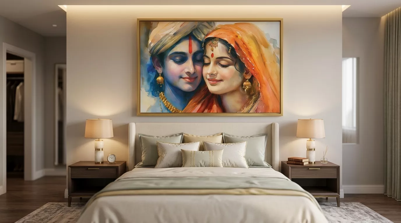 These symbolic meanings make it particularly meaningful for newly married couples and families.The Radha Krishna theme also blends effortlessly into modern interior design styles due to its elegant composition and balanced color palette.