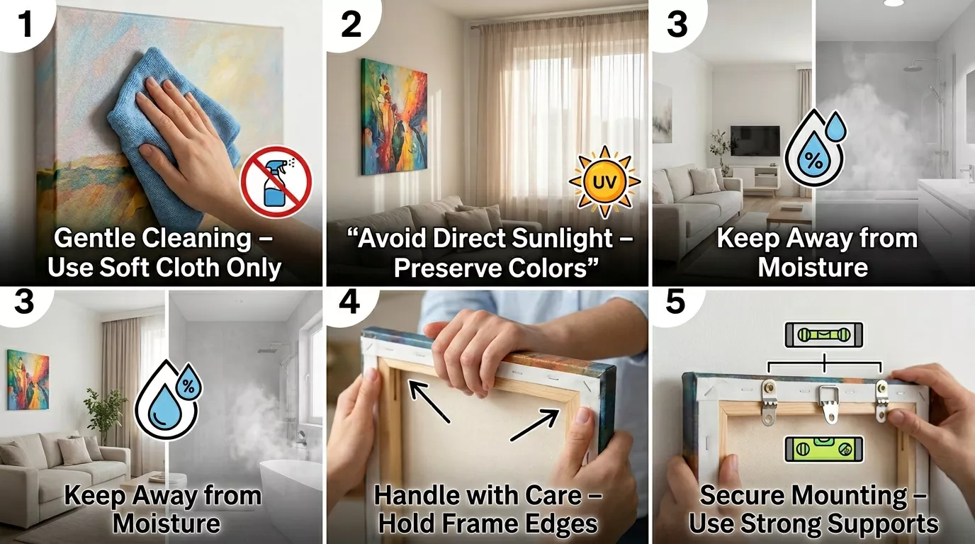 - Place the artwork in areas with indirect lighting to prevent color fading.